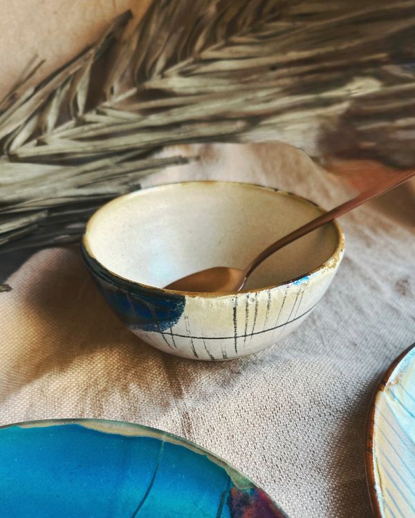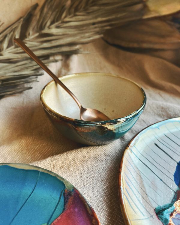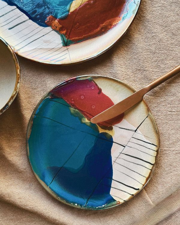 The Abstract Art Dinner Set combines abstract art, infused colors, subtle metallic hues, and superior craftsmanship in a single artistic handcrafted plates and bowls set. This beautifully-bold dinner set features abstract art, accentuated by random infused shades of blue, yellow, red, white, and beige, as well as subtle metallic accents.