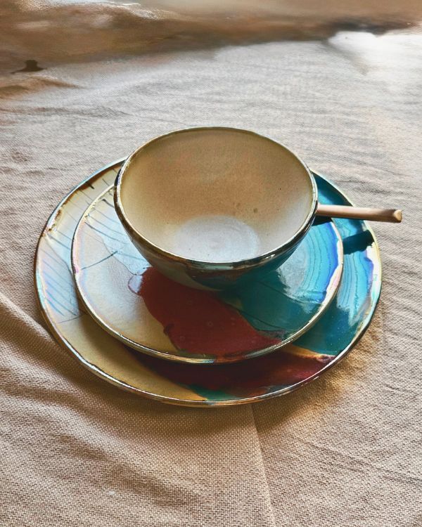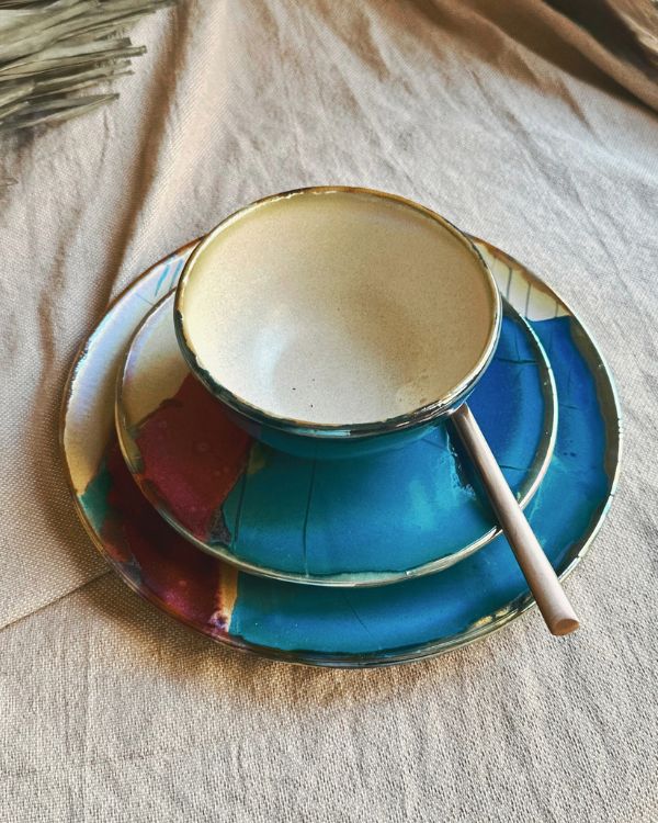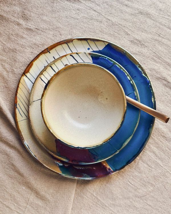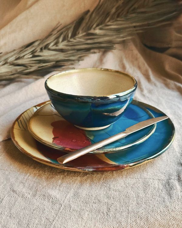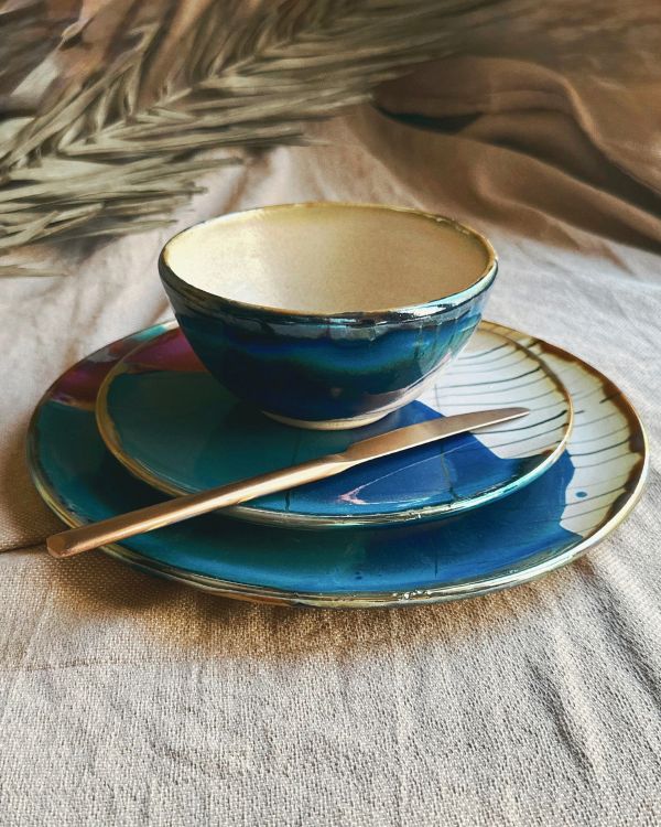 This is a handmade dinner set. Slight variations in color and shape happen from one product batch to another, but the product essence, design and color scheme stay the same. These variations add to the authenticity and uniqueness of each handmade tableware item.