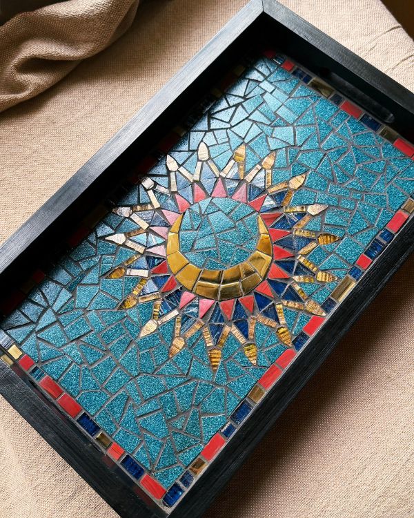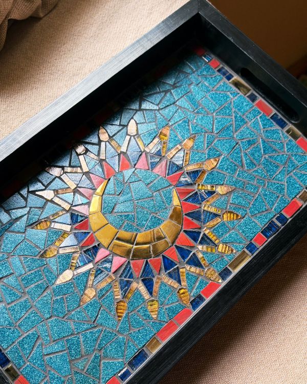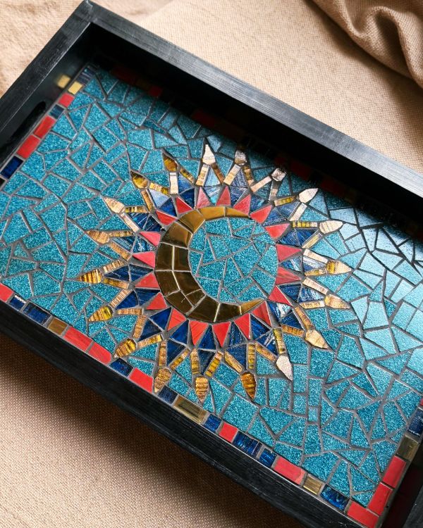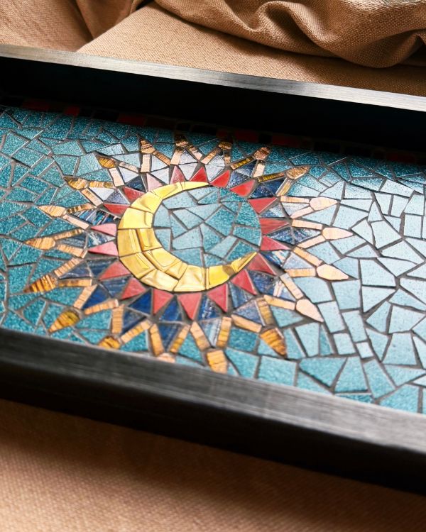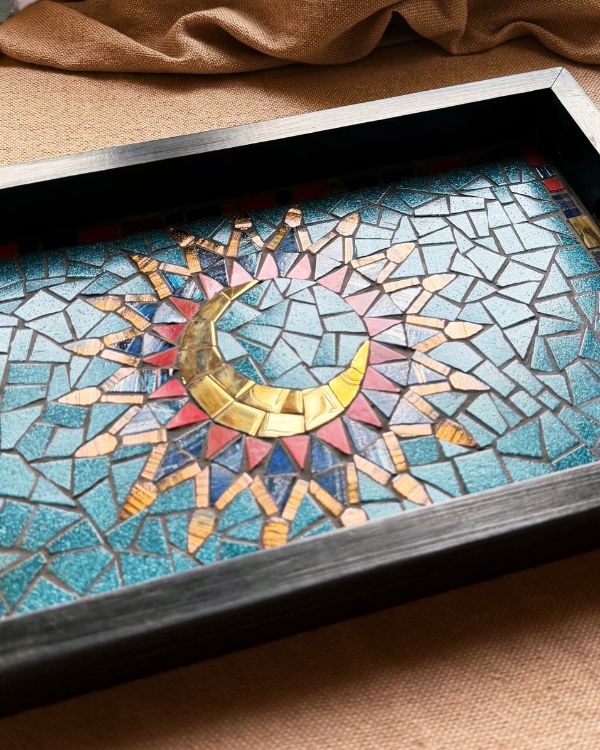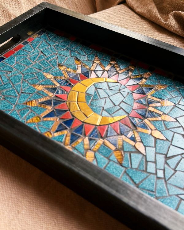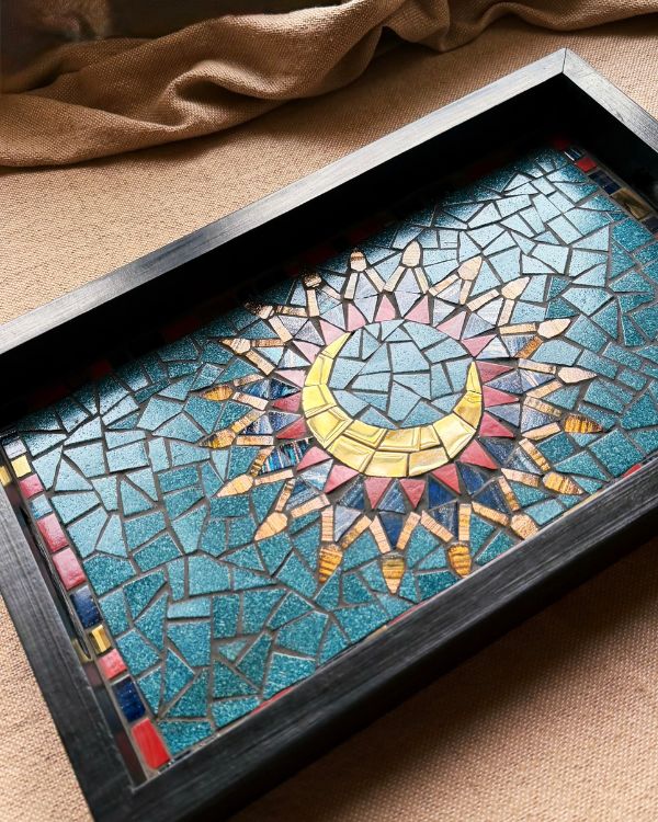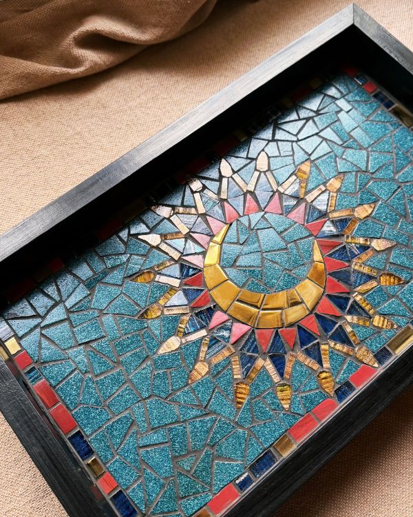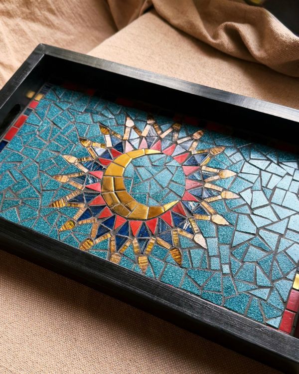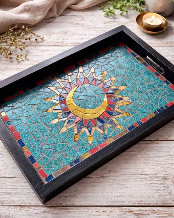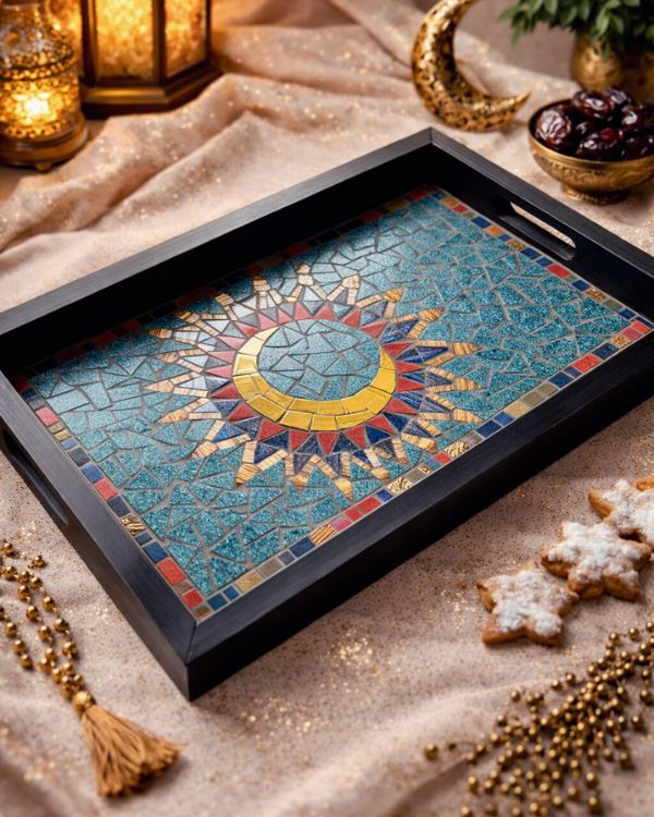 A striking celebration of Middle Eastern artistry, the Arabia Mosaic Tray features a radiant crescent motif set against a rich teal mosaic background. Hand-crafted with intricate tile detailing and framed in sleek black wood, this piece blends tradition with contemporary elegance.