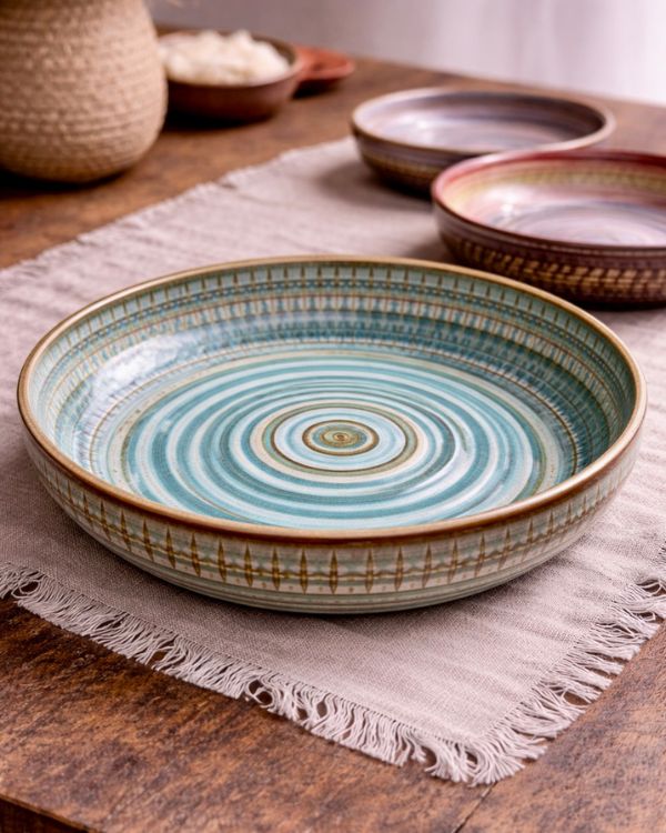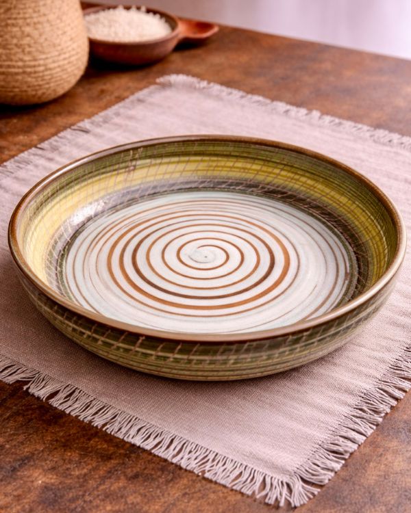 Earthy Spiral Deep Serving Dish (27 cm) — a generously sized, handmade ceramic serving dish featuring an earthy spiral glaze. Ideal for pasta, salads, roasted vegetables, and family-style meals. Crafted for everyday use and special gatherings alike.
