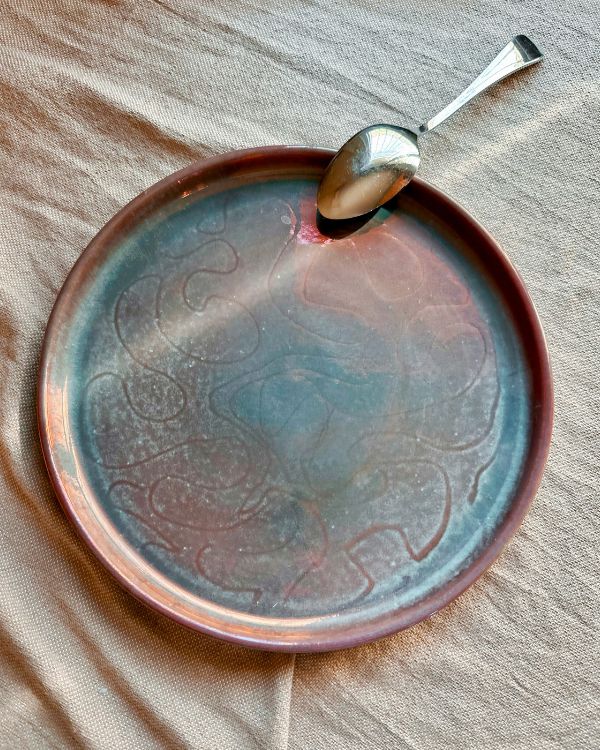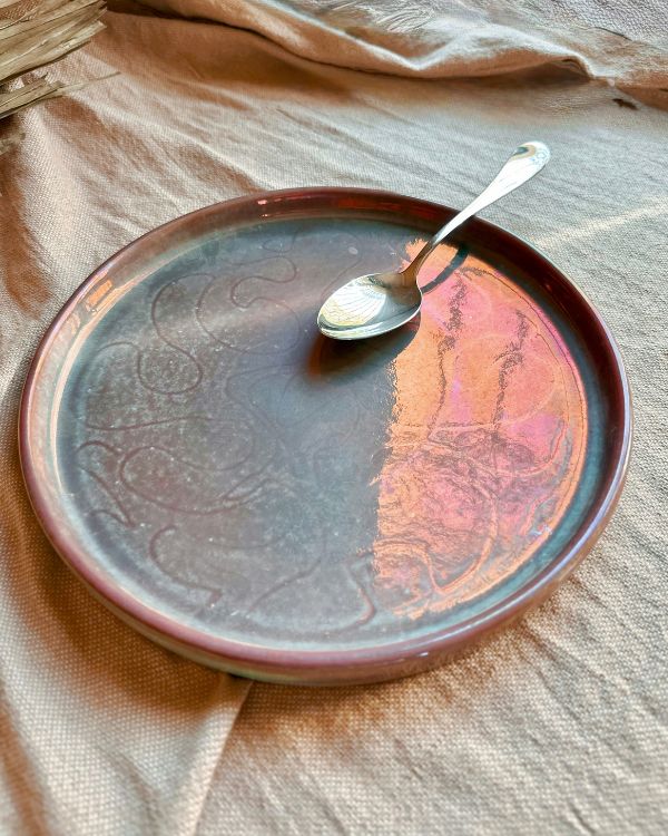 A mesmerizing fusion of artistry and functionality, the Rustic Art Serving Plate is a statement piece designed to elevate any dining experience. Handcrafted with meticulous attention to detail, this serving plate features a faded teal glaze that radiates beautifully with a crimson/maroon tint when it catches the light. The surface is adorned with delicate, abstract patterns, adding depth and texture to its design.