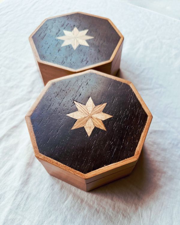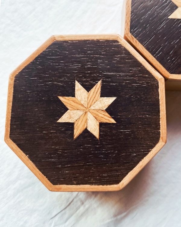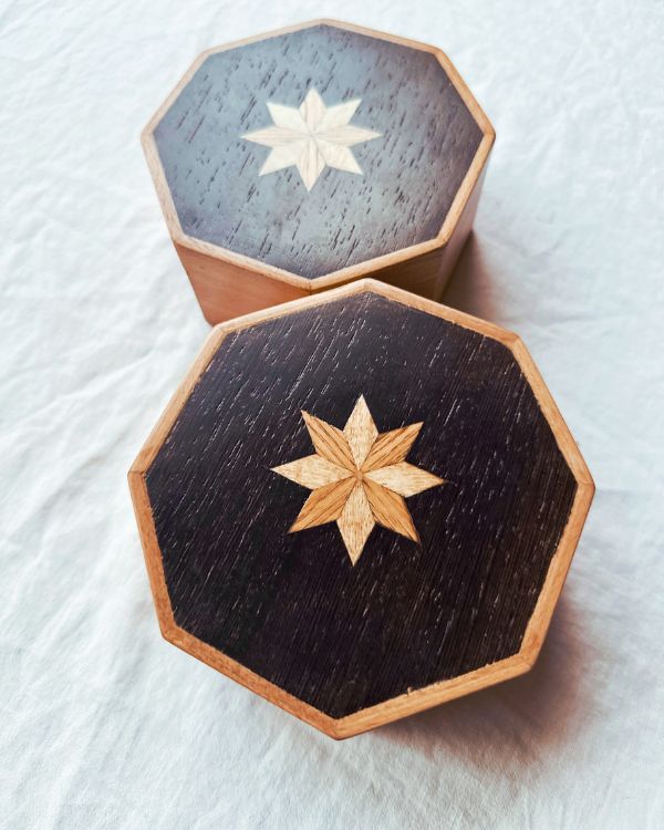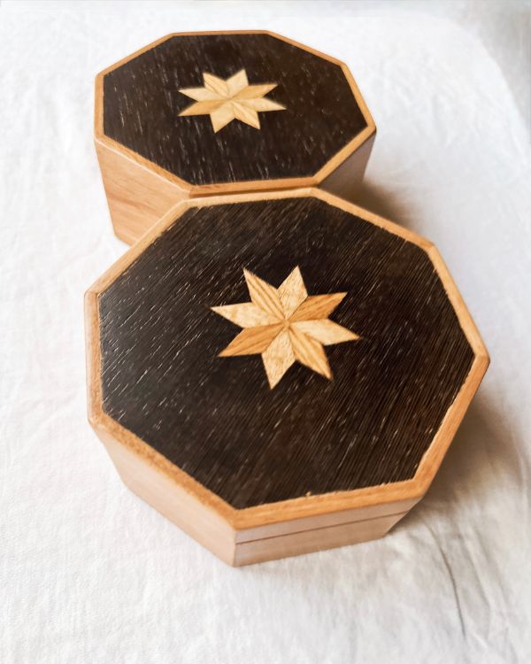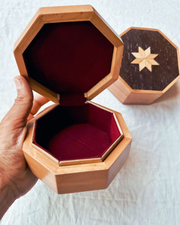 Beautifully-handcrafted medium wooden hexagon box featuring intricate geometric marquetry on the lid and a soft velvet-lined interior. Its medium size makes it perfect as a jewelry box, keepsake box, or gift box for special occasions.