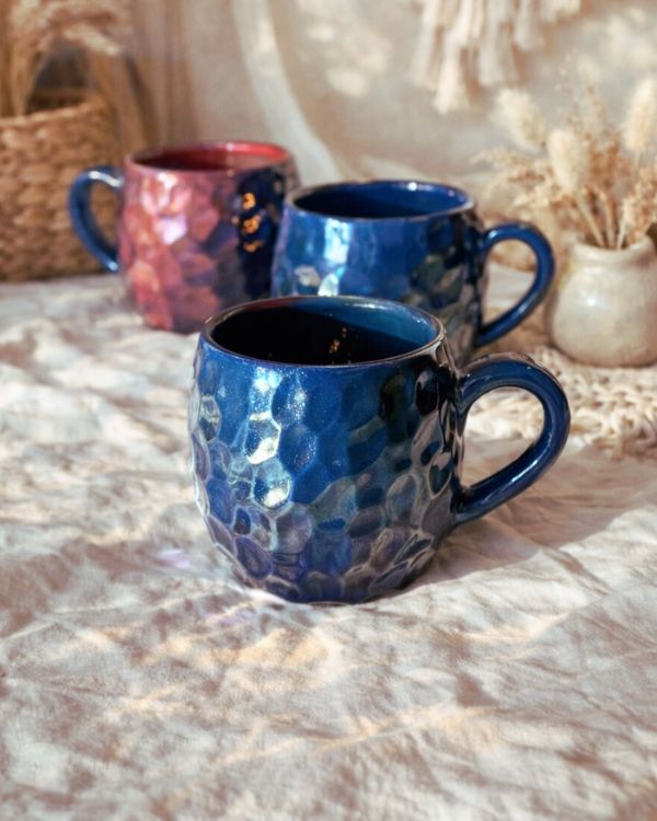 A deep, shimmering blend of midnight blue, and fiery red — all layered with an iridescent metallic glaze that gives each mug a unique, gem-like surface reminiscent of crystal formations and natural minerals.