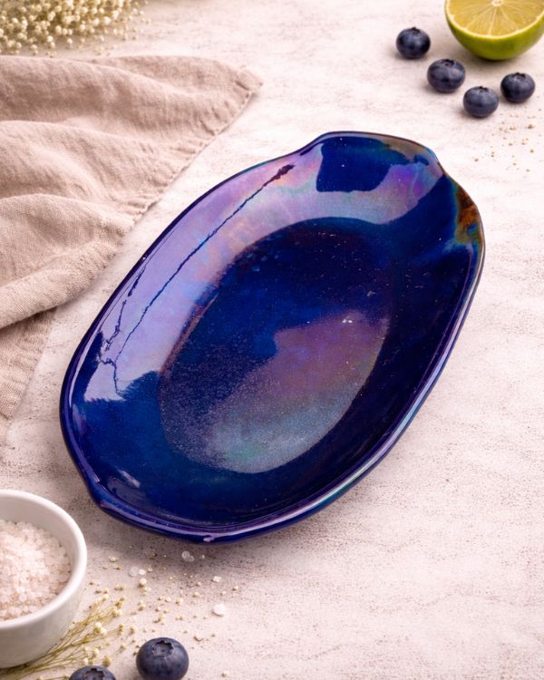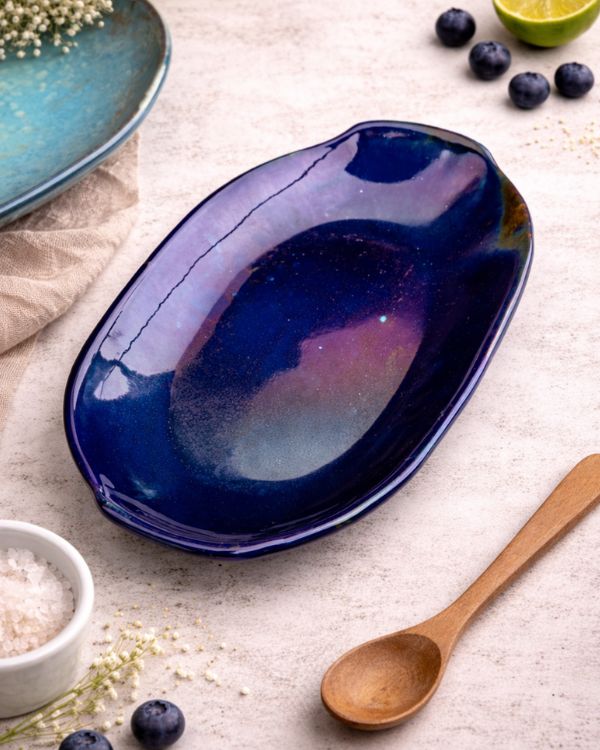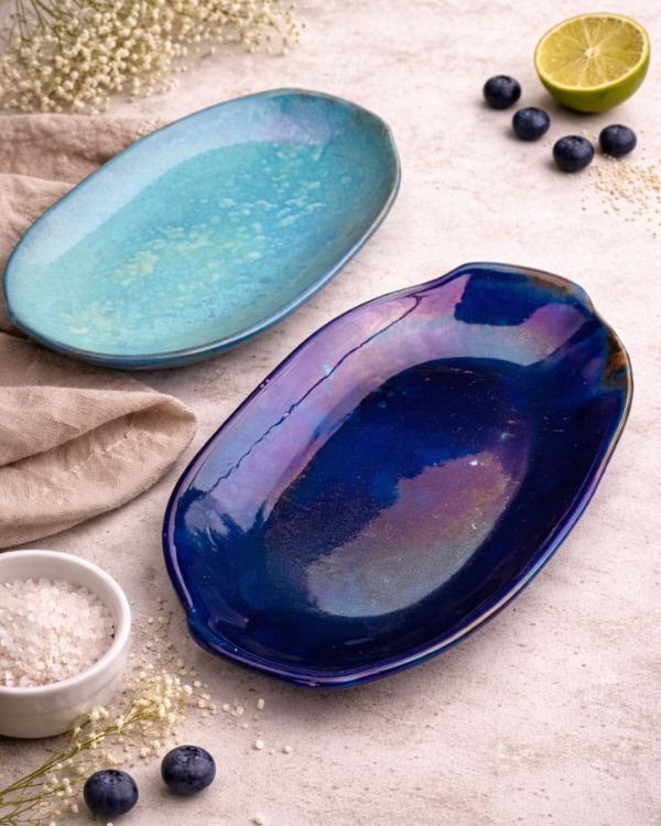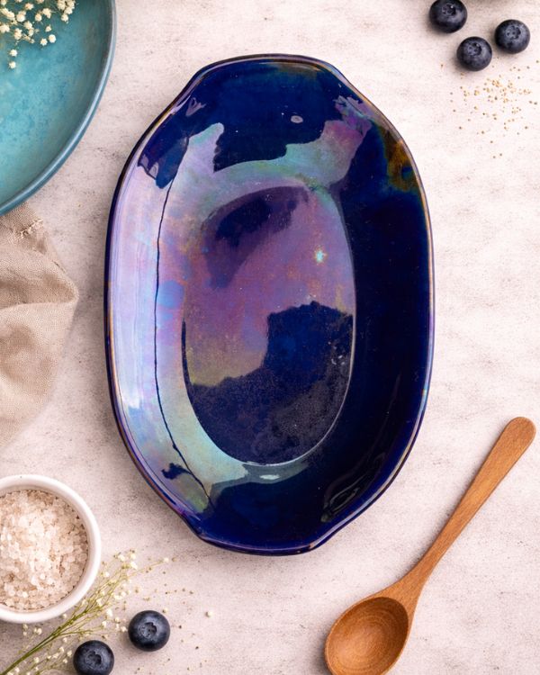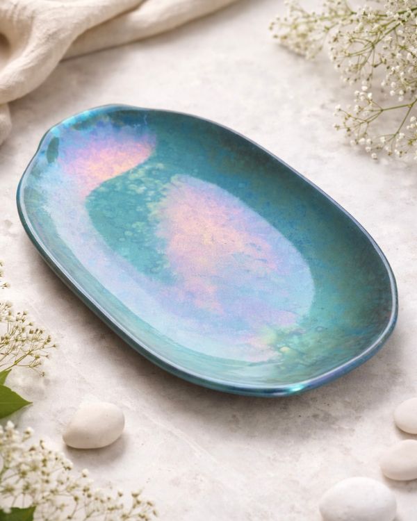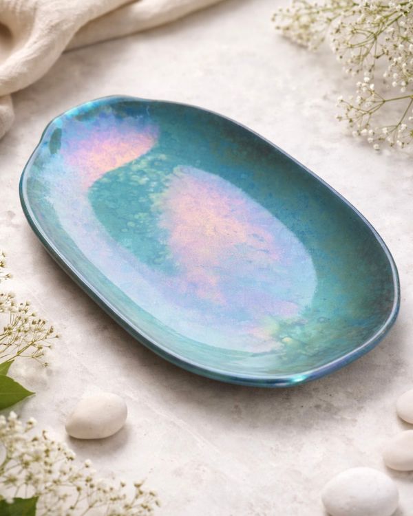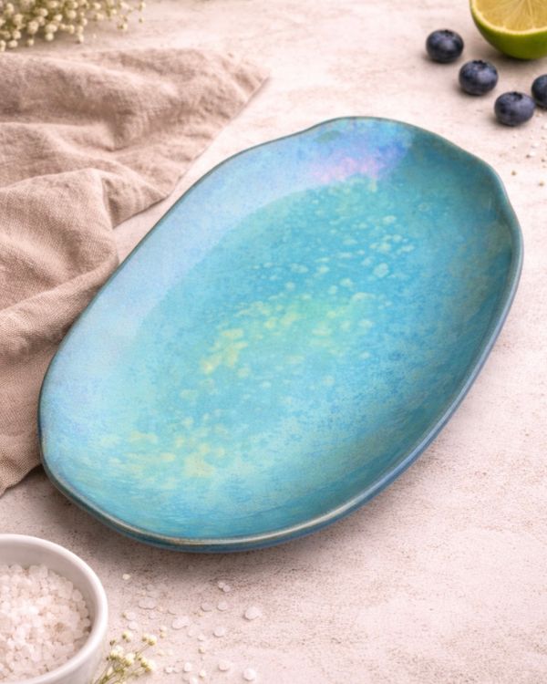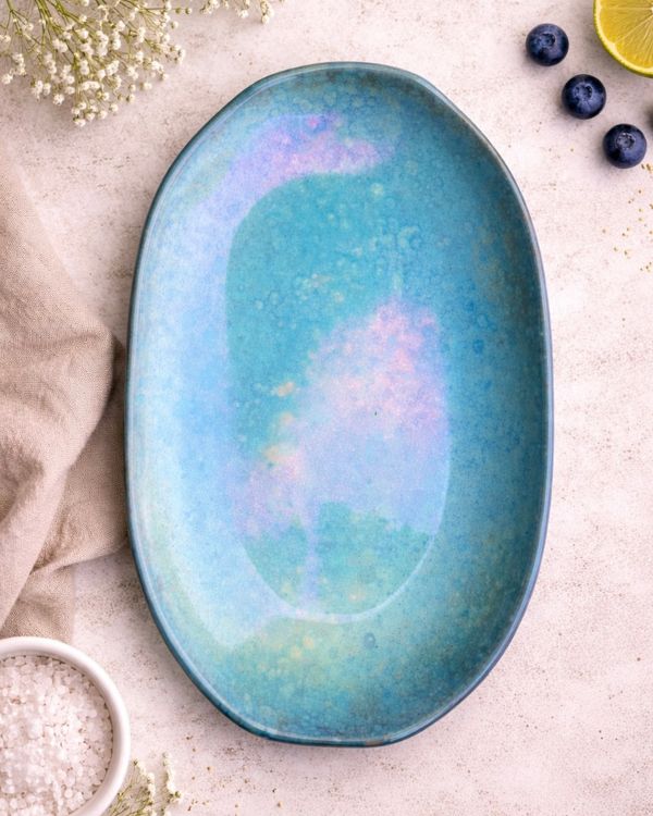 Bring a radiant charm to your table with the Ocean Shimmer Serving Platter. Its glossy finish shifts with light, revealing layers of magical colors. The organic, slightly wavy shape adds a natural touch, perfect for serving at gatherings. Additionally, it can be used as a centerpiece, or gifted to your loved ones.