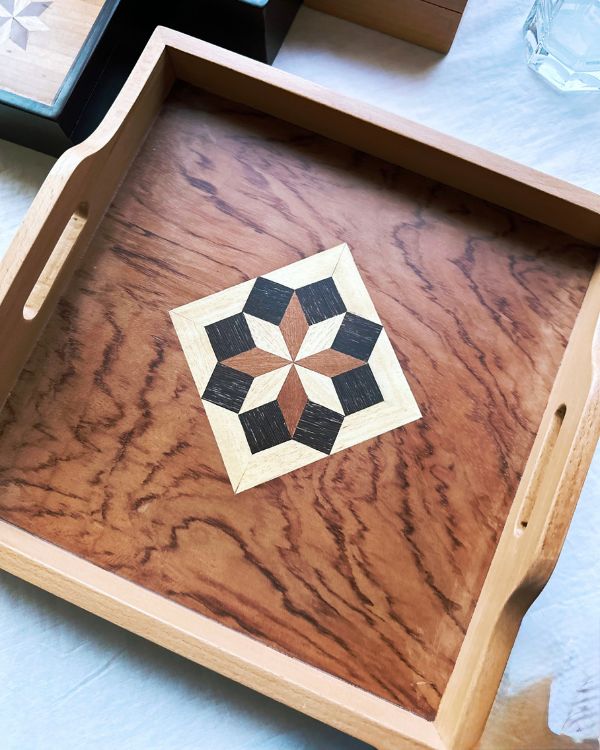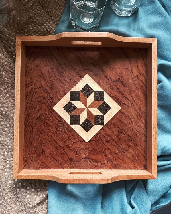 An elegant handcrafted wooden tray featuring a central star inlay that highlights natural wood tones and precision craftsmanship. The smooth surface and sturdy frame make it perfect for serving or displaying drinks and decor. A true blend of artistry and function — timeless, geometric, and refined.